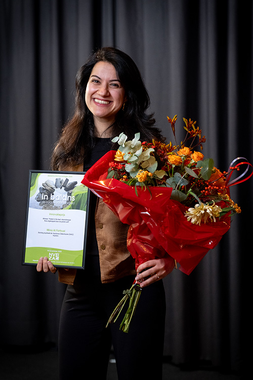 De Innovatieprijs is dit jaar toegekend aan Mina Al Fartousi (Stichting Apotheek der Haarlemse Ziekenhuizen (SAHZ)) voor haar project “Patient in the lead: chemotherapie thuis afgekoppeld door de patiënt zelf!